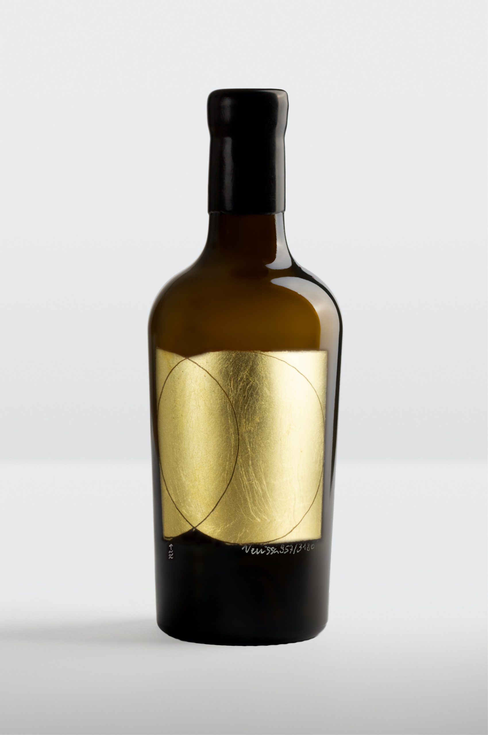 Nell’ideazione di Giovanni Moretti l’etichetta cede il posto ad una preziosa foglia d’oro, realizzata dall’ultimo discendente dell’antica famiglia Berta Battiloro. L’applicazione è stata eseguita secondo l’antica tecnica dei doradori veneziani, la bottiglia viene messa a ricottura nei forni delle vetrerie di Murano, venendo infine incisa a mano dalla famiglia Spezzamonte.